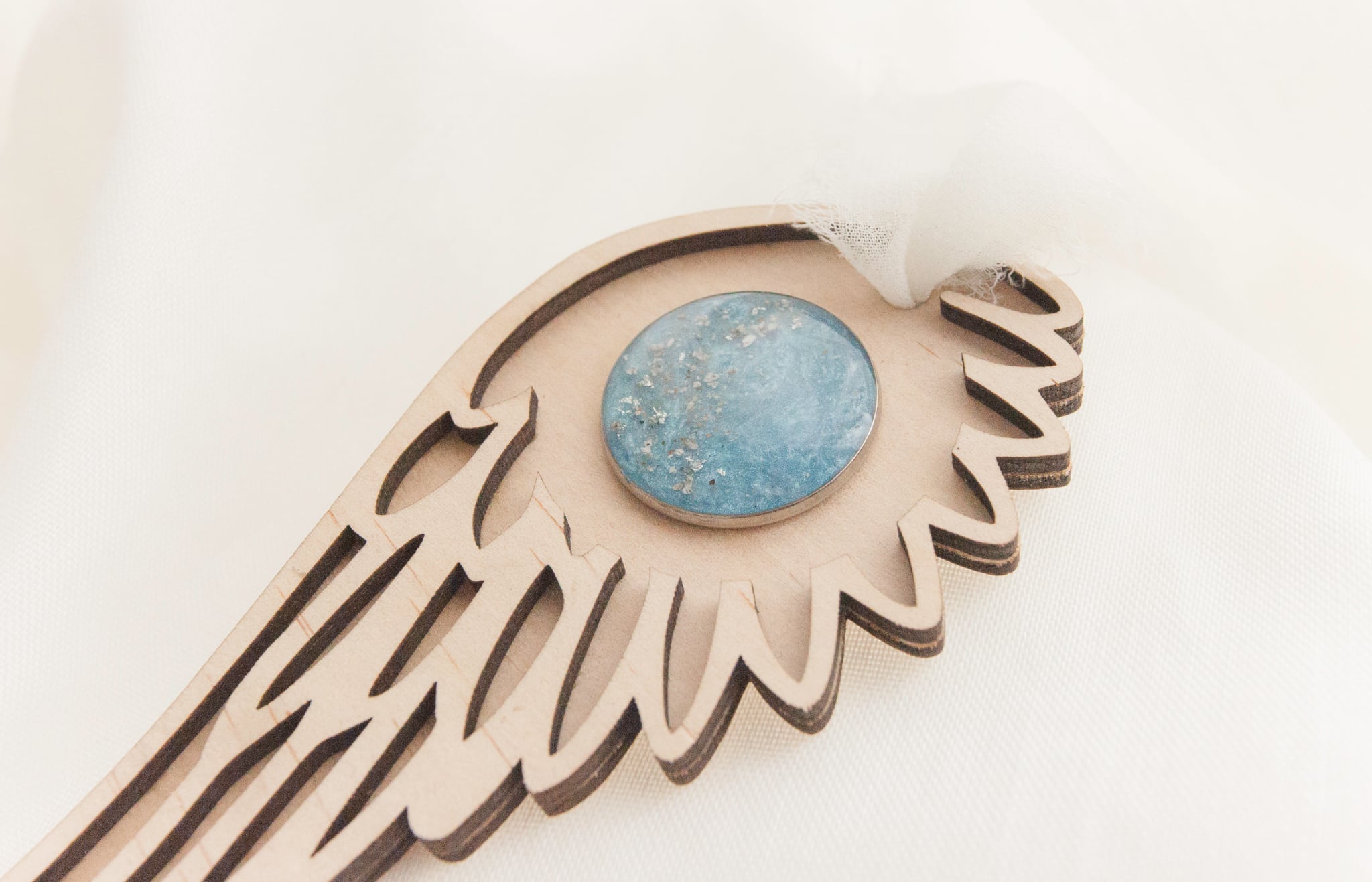 DETAILS - Double layer natural grain ply laser cut wing design that is affixed together. With loop opening at the top for the chiffon ribbon for you to tie yourself.