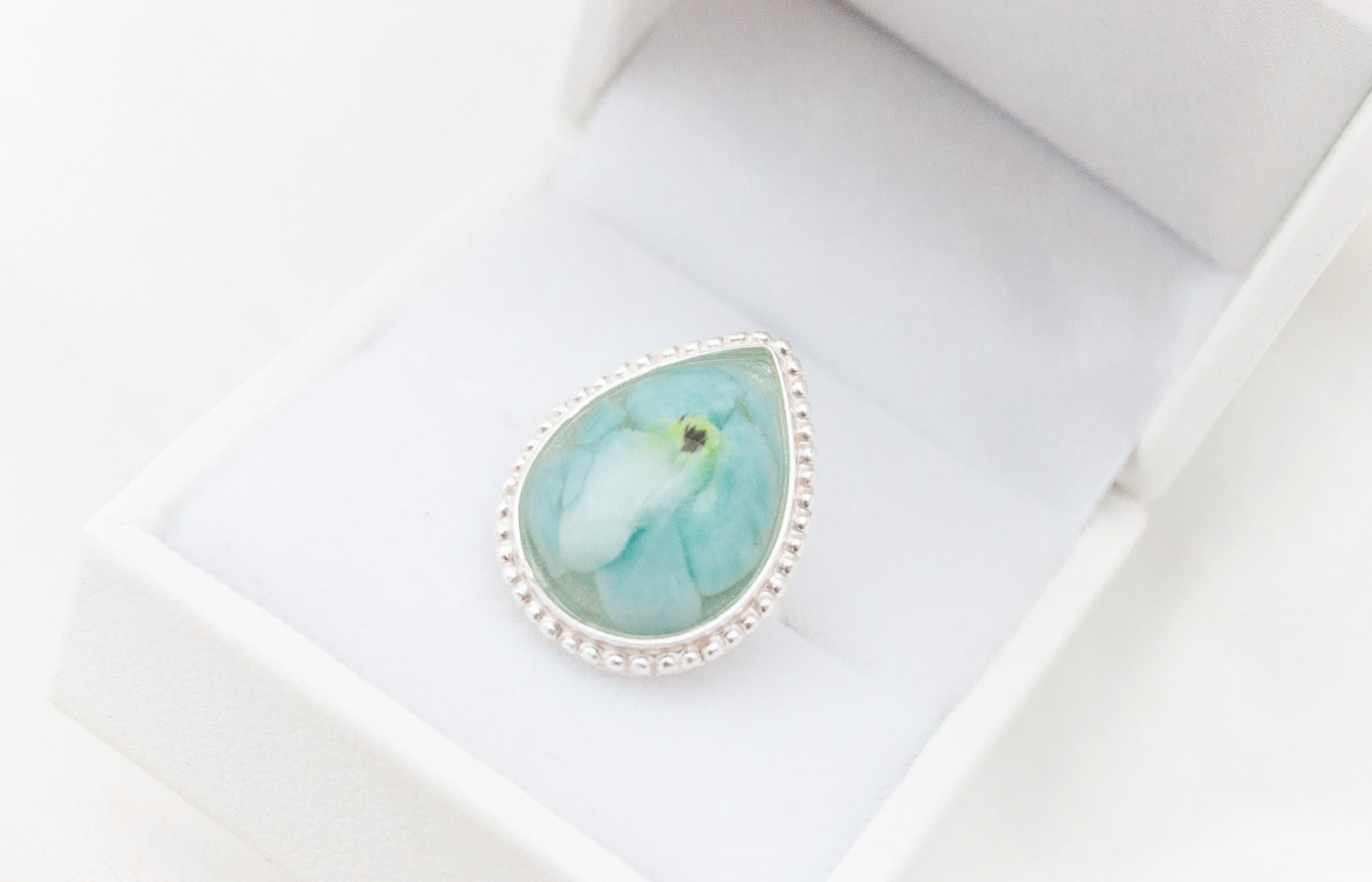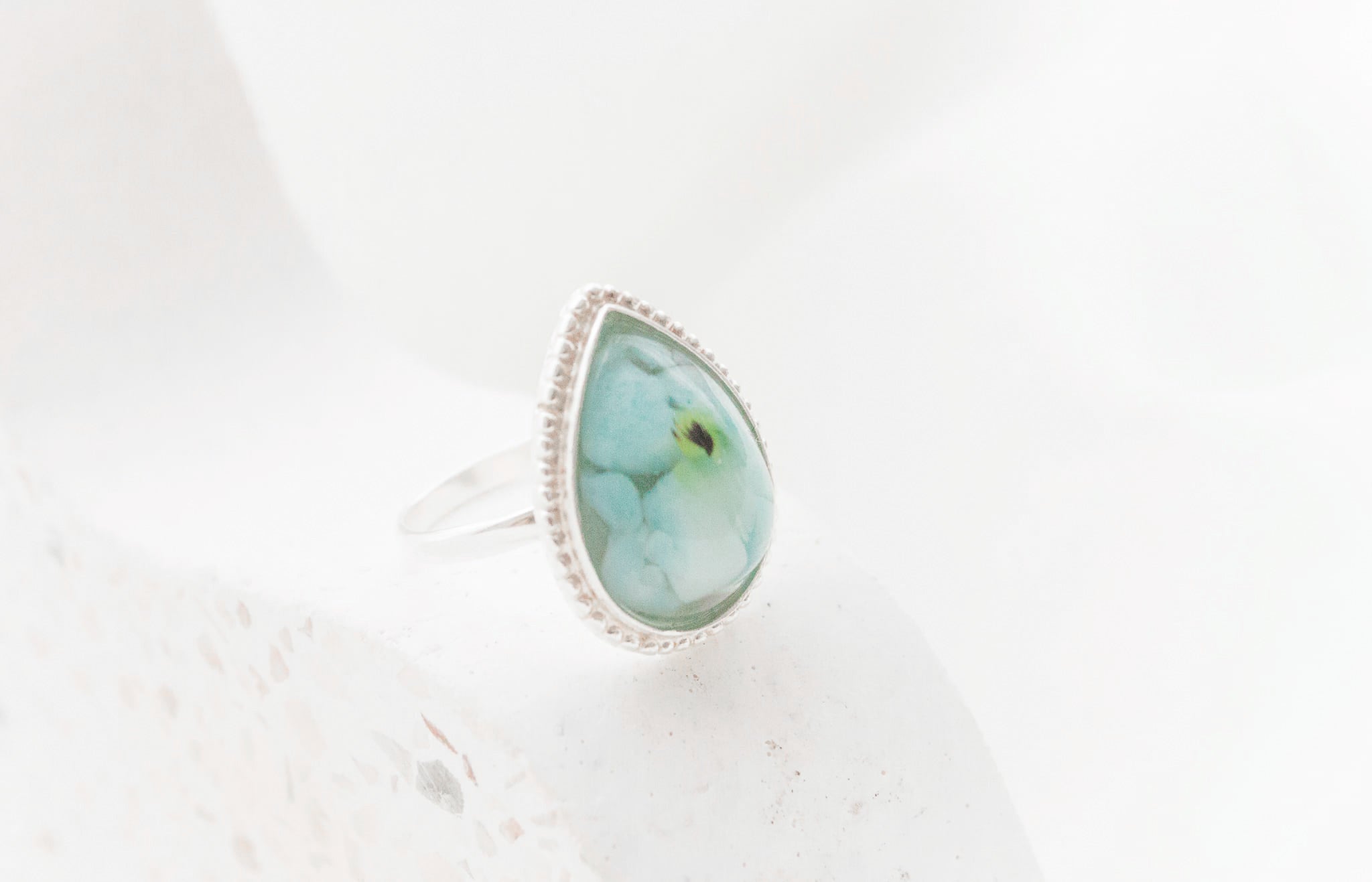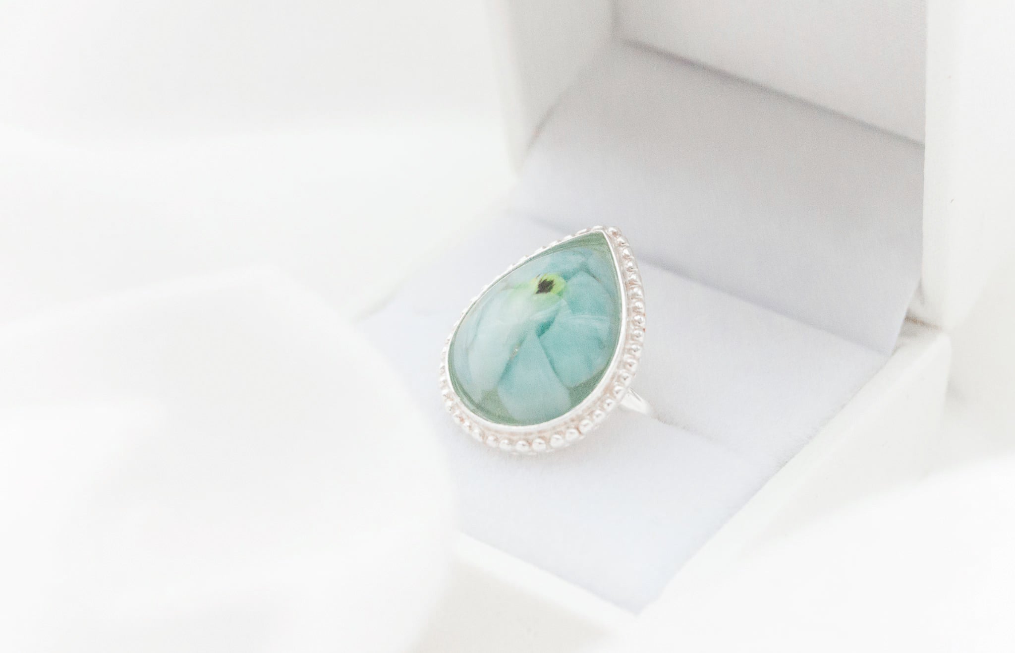 MATERIALS - 925 sterling silver handmade in India. High quality epoxy resin gem set inside the bezel. Slightly domed as high as we possibly can and as discussed. EDIT - APPROVED DOMED GEM IN TEARDROP SHAPE SLIGHTLY SMALLER THAN BEZEL RING BUT CREATED WITH TOPLAYER TO FIT INSIDE AS BEST AS POSSIBLE.